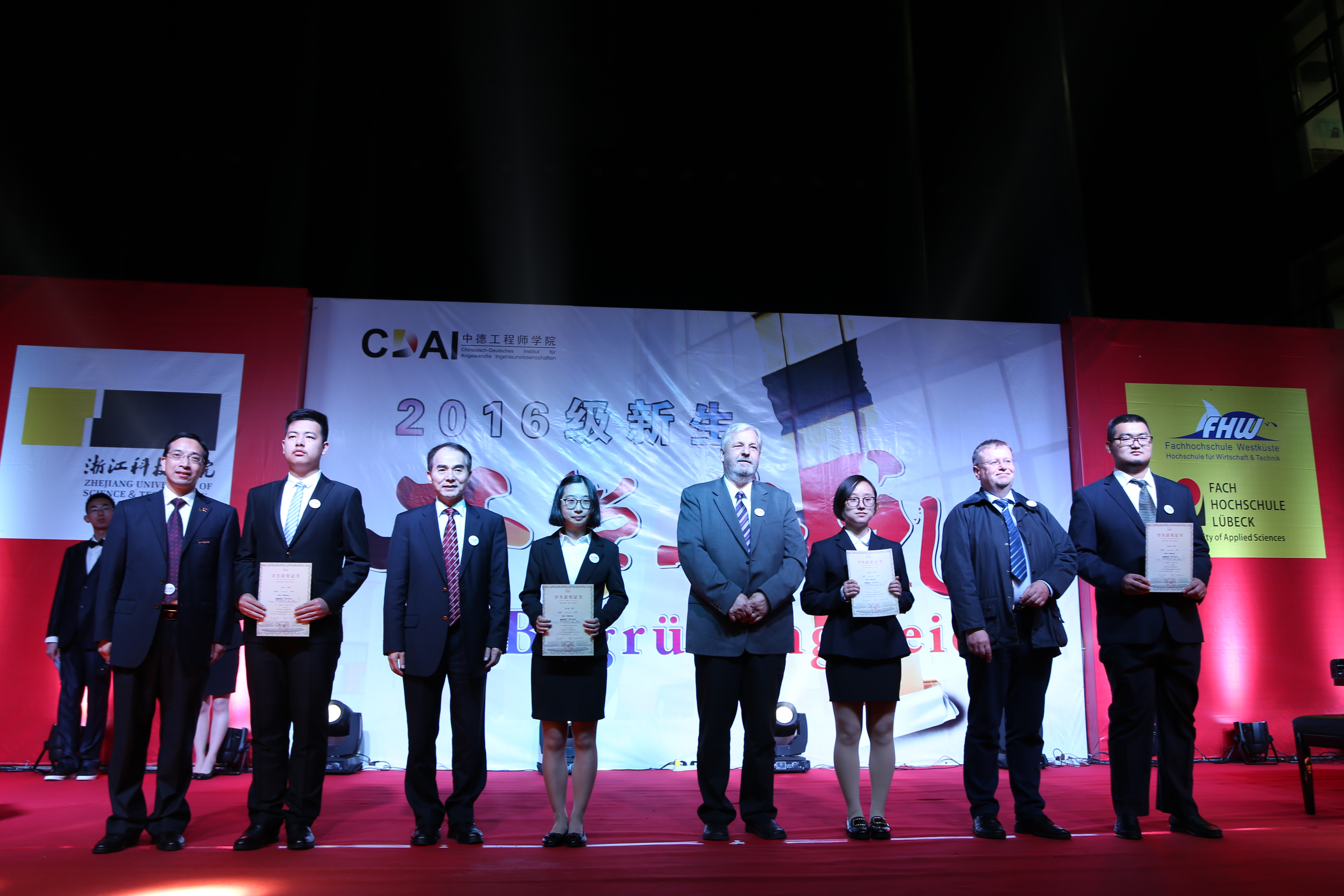 18:30,在精彩的古筝演奏后,学院院长徐理勤、教学院长弗郎克·肯普(Frank Kemper)致欢迎辞,开学典礼正式开始。浙江科技学院校长叶高翔、吕贝克应用科技大学副校长利兹教授和西海岸应用科技大学校长科尔希教授分别为16级新生致辞,勉励同学们在今后四年中更好的学习,珍惜美好的大学时光。浙江科技学院副校长冯军宣读新生奖学金获奖名单,出席典礼的中德双方高校领导和教授们为获奖同学颁发证书。老生、新生代表分别上台发言,畅谈理想与感悟。期间还有学院15、16级学生分别带来的乐器演奏,让人陶醉其中。最后,本次开学典礼在欢声笑语声中圆满结束。
