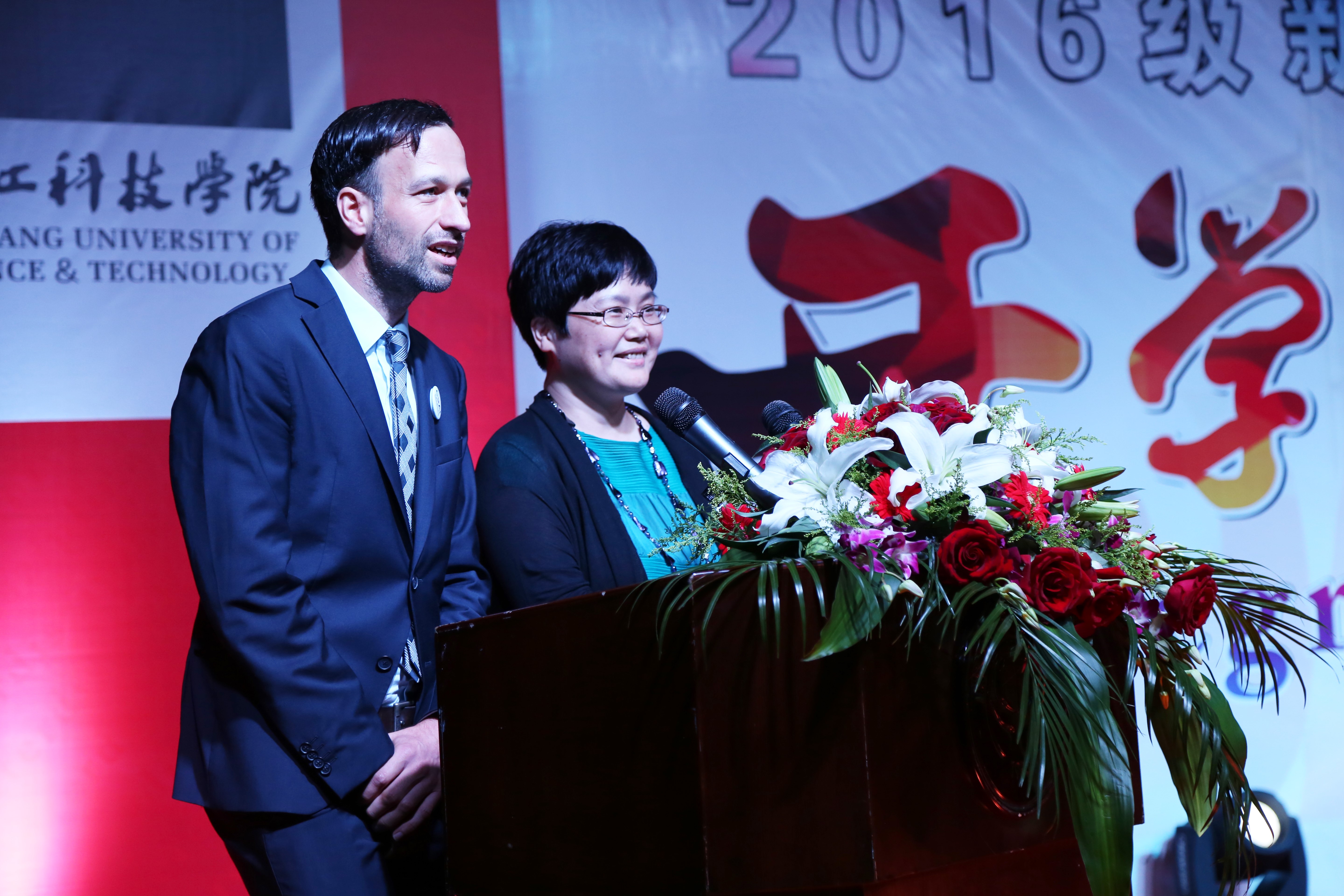 2016年11月6日晚,浙江科技学院91网 2016级新生开学典礼在浙江科技学院安吉校区中德楼隆重举行。德国西海岸应用科技大学校长哈诺·科尔希(Hanno Kirsch)、吕贝克应用科技大学副校长约翰森·利兹(Joachim Litz)、我校校长叶高翔、副校长冯军、副校长郑友取、校长助理鲁伟权出席。91网 领导、学校相关职能部门领导、中德双方教师、学院老生代表和学院全体16级新生近200人参加此次盛会。