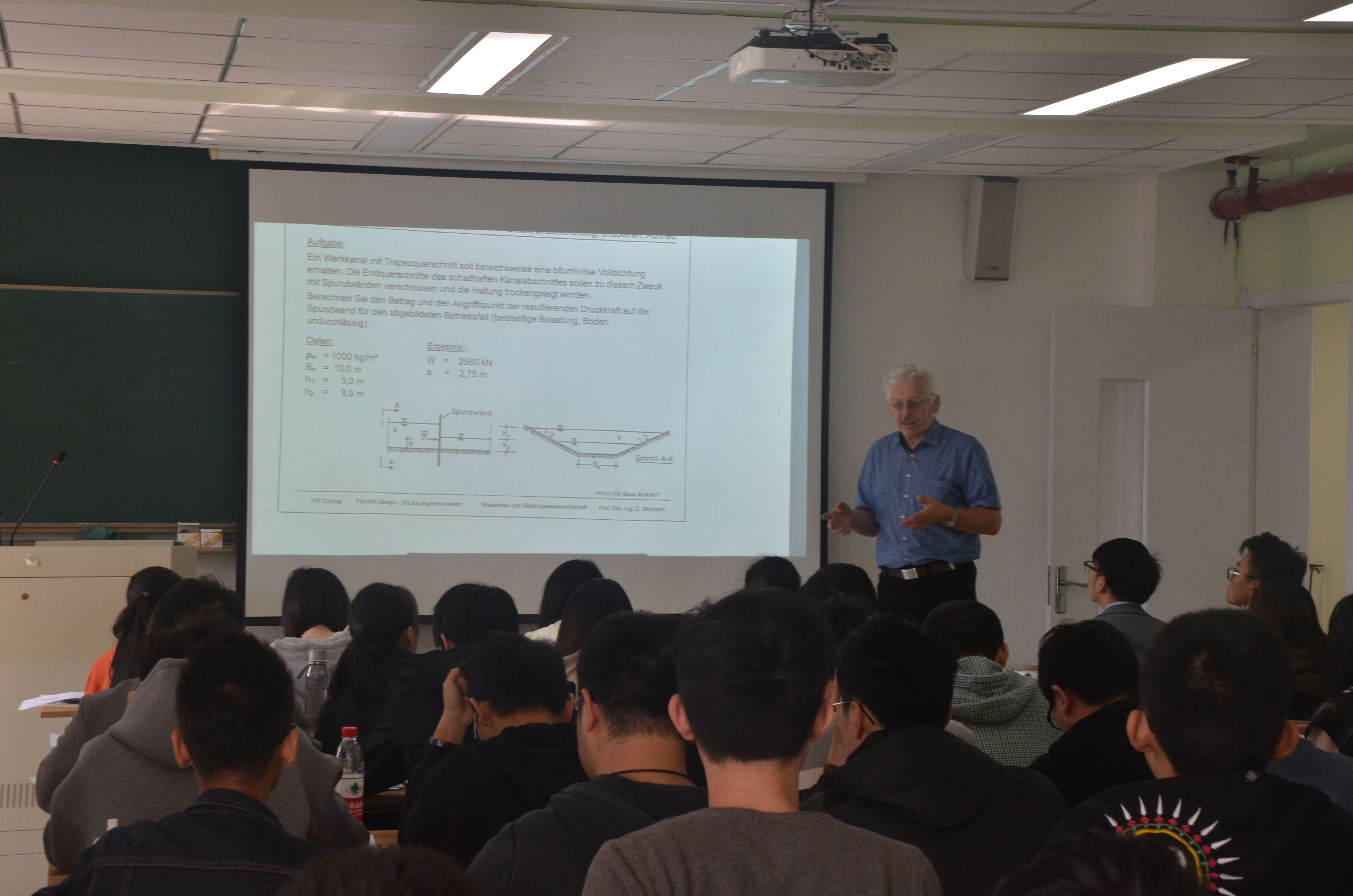 10月23日上午,来自德国科堡应用科技大学的迪特尔•舒兹曼教授开始为91网 15级土木的同学讲授为期两周的《流体力学》课程。这是15级土木专业的同学们第一次经历的德方教授集中授课,同学们非常重视这次集中授课,部分同学在暑假就花时间查询整理了该门课程的相关德语专业词汇,以便于更好地理解这门课程。