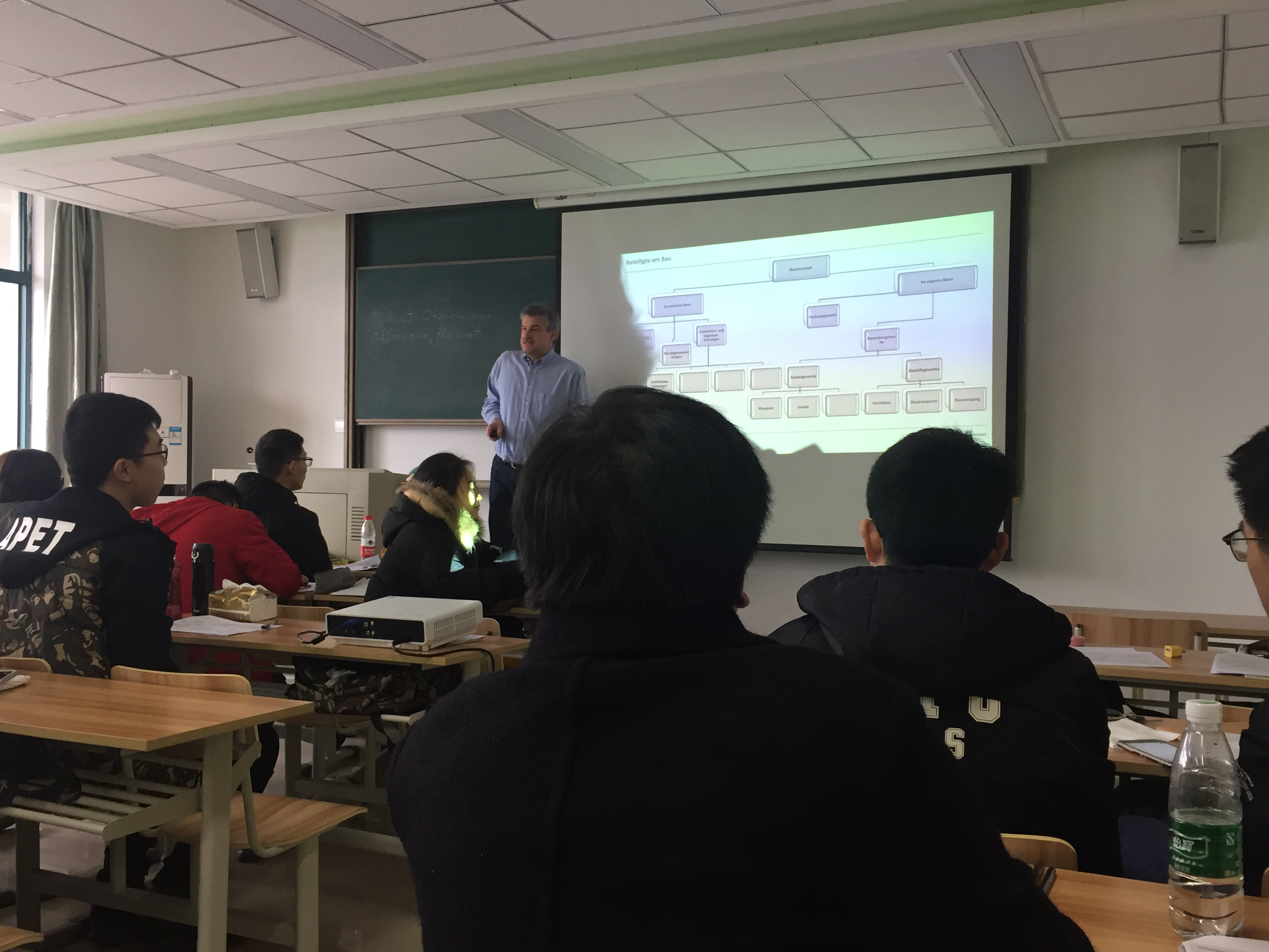 3月5日上午,德国吕贝克应用科技大学的Offermann教授开始为91网 15级土木专业的同学讲授为期三周的《项目管理》课程,教学以课堂教学为主,并用视频播放的方式加深同学们的印象。这是15级土木专业的同学第二次接受德方教授的集中授课教学了。同学们对于长时间而又高强度的德语教学早就有了心理准备,在上学期就已经对德语专业名词进行了系统的学习,对于专业课的德语词汇有了一定的积累。上课也能更多地听懂教授的讲解。同学们上课认真听讲,下课能与教授积极探讨问题,同学之间互相交流疑问,教室里洋溢着浓重的学习氛围。