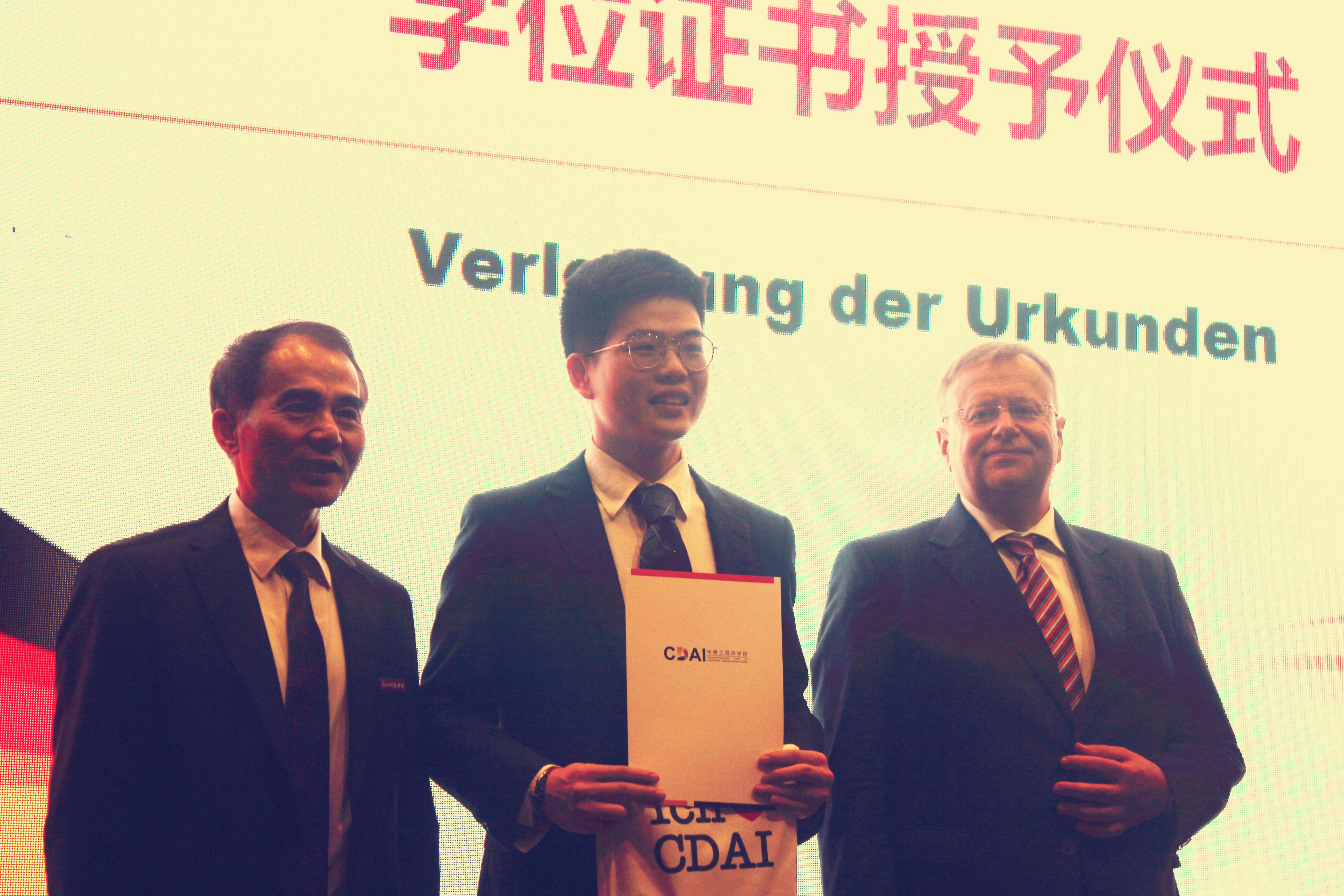 三方校领导为每一位毕业生颁发了毕业证书及学位证书并合影留念。校长叶高翔代表浙江科技学院向圆满完成学业的毕业生表示了祝贺,他希望同学们有理想,有抱负,有国际视野,把个人远大的目标与本职工作结合起来,与人类的未来结合起来,为了中德两国的友谊和未来、为了人类文明的进步事业而不懈努力。两位德方校长也对毕业生们表示了祝贺,并希望融合了中德两国高等教育优势的同学们可以重新出发,为中德两国的经济发展和友好合作做出积极贡献。