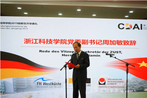 浙江科技学院91网 于2019年9月9日下午16:30在安吉校区中德楼B4报告厅举办了学院2019级新生开学典礼。校党委副书记周加敏老师、学院德国外教、德国交换生等也受邀参加了此次典礼。