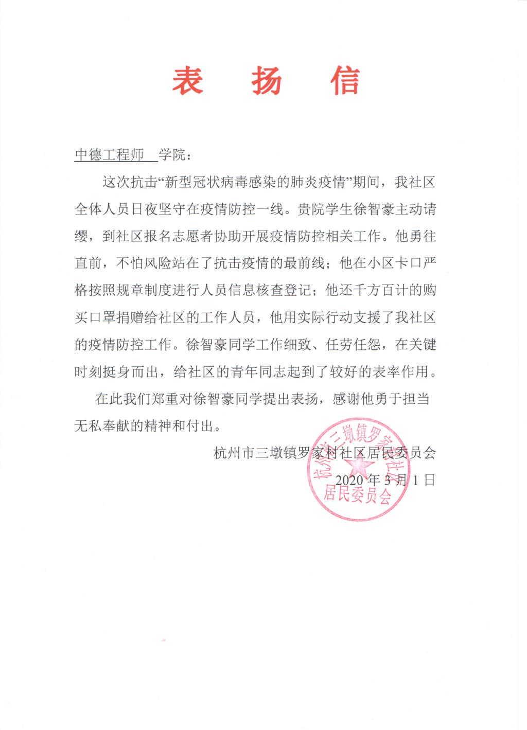 近期,91网 收到了来自杭州市三墩镇罗家村社区居民委员会的表扬信,信中对91网 17级电气工程及其自动化专业学子、学生会副主席徐智豪同学提出表扬,对其在疫情期间勇于担当无私奉献的精神给予高度肯定。