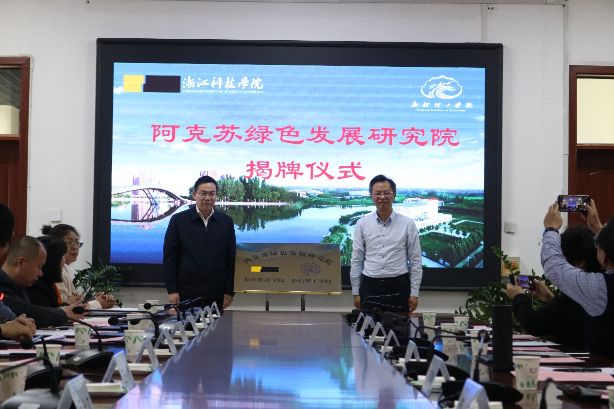 阿克苏绿色发展研究院是我校贯彻中央和省委关于“科技援疆”的重要精神,也是落实两校战略合作框架协议的具体工作。其筹备及成立亦得到了浙江省援疆指挥部的大力支持。揭牌仪式后,符宁平副书记与我校参与研究院筹建的骨干教师一道,与新疆理工学院领导及参与研究院工作的教师代表交流座谈。