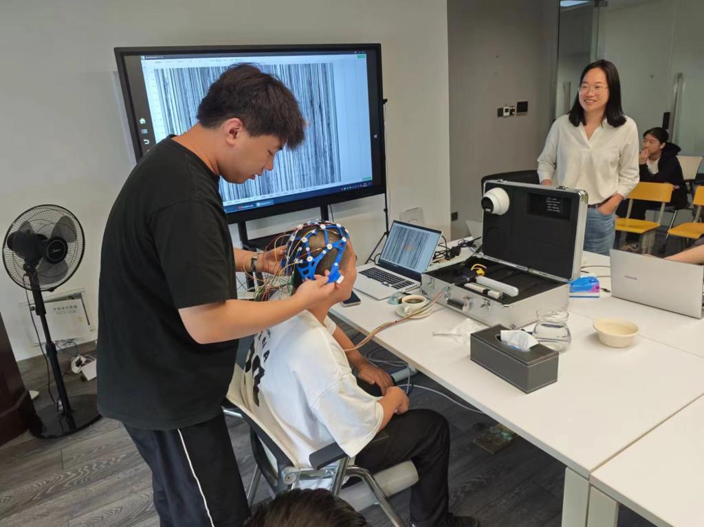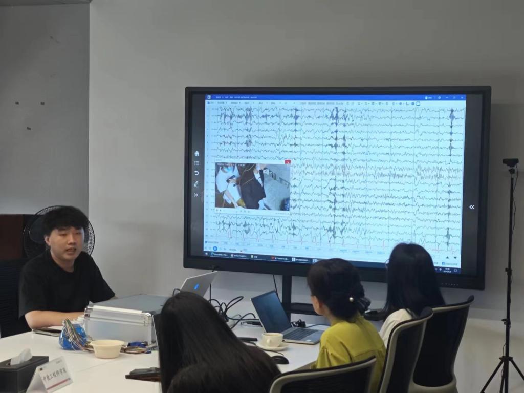 陈宸先生从专业的角度为同学们讲解了脑疾病与脑电波之间的关系,解释了脑电检查的重要性和改进脑电检测方法的必要性并指明了物联网是脑科学发展的一个重要方向。陈宸先生还为同学们带来了其公司开发的脑电图机产品,并邀请同学亲身体验。在两位主讲人的帮助下,四位同学先后进行了脑电检查,并得到了AI分析得出的检查报告。