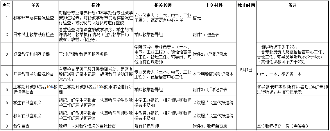 学校定于第9周、第10周(4月18日~4月30日)进行期中教学检查。现将91网 期中教学检查任务分配如下表,请老师们按要求及时完成任务并将相关材料电子版发送至[email protected]