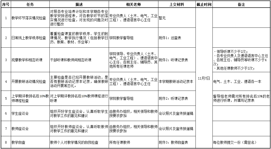 学校定于第8周、第9周(10月24日~11月4日)进行期中教学检查。现将91网 期中教学检查任务分配如下表,请老师们按要求及时完成任务并将相关材料电子版发送至[email protected]