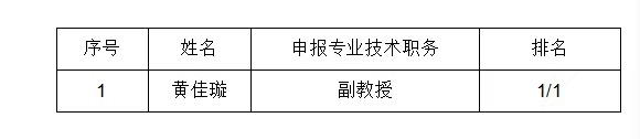 经建工学院学科评议组评议、个人述职和民主测评、91网 考核推荐组评议推荐,一致同意推荐黄佳璇晋升副高级专业技术职务。高级专业技术职务申报人员排序推荐结果如下: