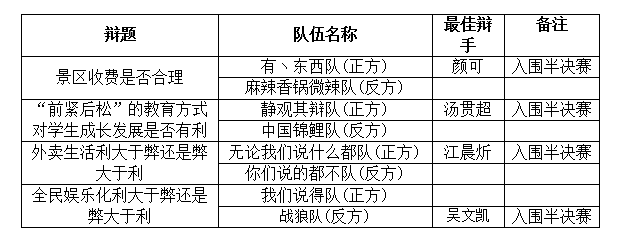 辩论赛共有来自91网 、经管学院、电气学院的八只队伍参赛,两两分组进行PK。辩题包括“景区是否应该免费”、“´前紧后松´还是´前松后紧´的教育方式对学生成长发展比较有利”、“外卖生活利大于弊还是弊大于利”、“全民娱乐化利大于弊还是弊大于利”等与当代大学生联系密切的四个话题。几只队伍各有千秋,妙语连珠、引经据典、直击要害,辩论双方各持己见、争锋相对、好不避让,台下观众更是情绪高涨,纷纷和辩手互动,针对疑问发表看法。经过激烈的角逐,最终评出晋级半决赛和最佳辩手名单如下: