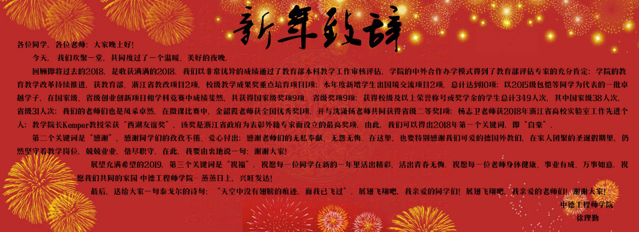 16:30中德E楼咖啡吧包饺子现场,大家热情高涨,跃跃欲试。在欢声笑语中,热腾腾的饺子出炉了,脸上洋溢着劳动的喜悦。随即,温馨而热闹的元旦晚会在B4报告厅拉开帷幕。或是炸裂全场的集体舞蹈,或是深情款款的吉他弹唱,或是爆笑演绎的安全小品,或是震动人心的全场合唱,无不包含着CDAI学子们的多才多艺和对学院的深深祝福。全体同学在礼物交换中感受来自他人的温暖,在游戏环节尽情投入乐在其中,在学长学姐感悟中规划新一年的学习生活。学院直属党支部书记、院长徐理勤老师与直属党支部副书记、学生工作负责人李成炜老师发表新年致辞,回顾2018年,为大家送上新年的祝福,鼓励大家不断前进。