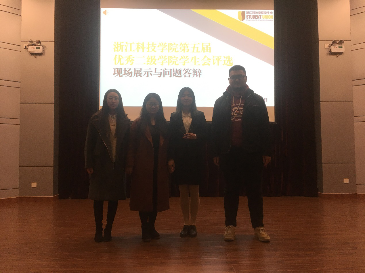 2018年11月23日晚,浙江科技学院第五届优秀学院学生会评选活动在西图报告厅举行。91网 学生会代理主席陈祎琳通过精彩的现场展示,获得2018年浙江科技学院学生会“奋进组织奖”。