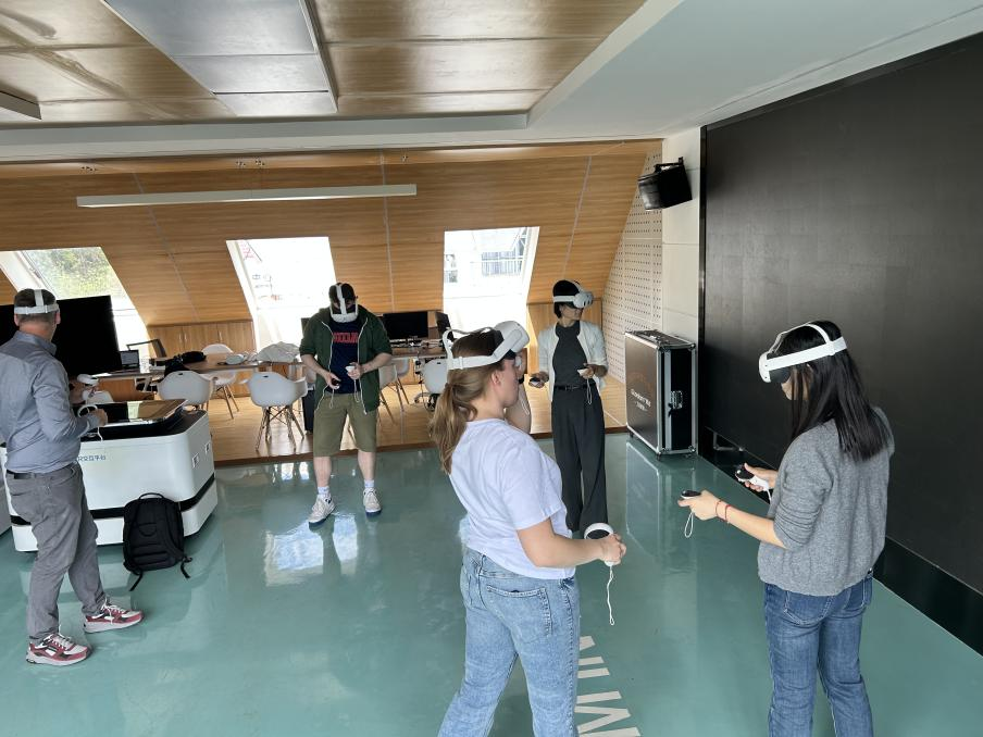 多年来,Elsche教授一直从事虚拟仿真相关教研项目,开发了土木工程虚拟教学场景,戴上VR眼镜即可在虚拟仿真的教学场景中跟随教授参观不同的结构模型,如屋架构造、楼板配筋等,参与人员在虚拟场景中以颜色区分身份,通过操控手柄飞行模式跟随听课。有别于91网 数字建造实验室使用的VR眼镜,这次德方带来的眼镜属于升级版,不受上课场地限制,可以随时随地开展虚拟课堂。