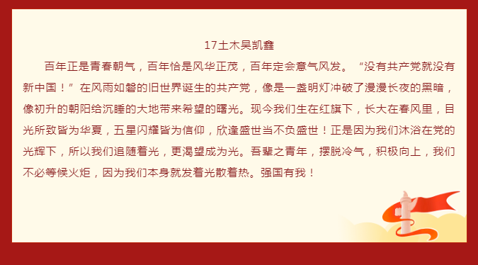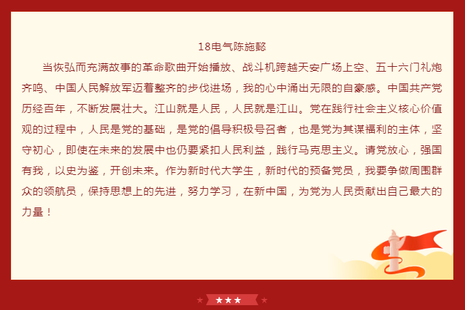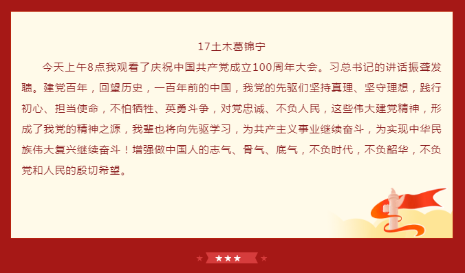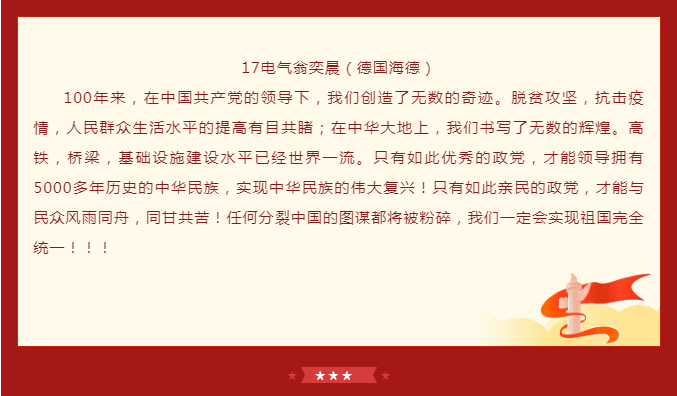 学院师生党员通过实时观看,对“没有共产党就没有新中国”有了更深刻的体会,纷纷表示心中有信仰,脚下就有了力量。中国共产党披荆斩棘,经风雨,战胜一次又一次艰难险阻,迎来如今的辉煌。作为党的一份子,行动上要自觉将学习、工作与国家的命运结合起来。范佳静书记表示,作为91网 直属党支部书记,将继续弘扬伟大的中国共产党精神,不断加强学院党建引领作用,推动学院内涵式发展,办好中德深度融合的91网 ,为培养一批批具有国际化、应用型工程背景的社会主义建设者和接班人而努力。“青年强则中国强”,她希望在座的青年学子们认真学习习近平总书记重要讲话精神,不断坚定理想信念、增强学识本领,把青春奋斗融入党和人民事业中。德国西海岸的学子们观看完大会回放后感慨到,生在这个伟大的时代,作为一名中国人无比骄傲。身处异国他乡的他们,更能感受到祖国的强大和温暖,也将坚定地听从党的召唤,祖国和人民的召唤,继承这份意志,将党员精神发扬光大。