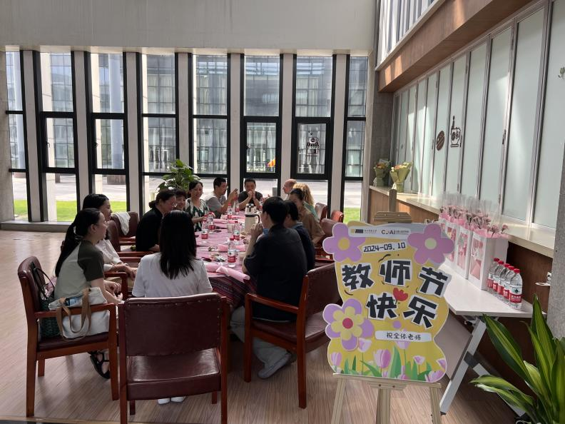 学院在中德E座大厅举办了慰问教职工座谈会,不同学院不同国籍的老师们欢聚一堂,分享心得体会,增进了学院之间的交流;学工部组织学生将教师节花束送给了正在上课的老师,感谢老师们辛勤耕耘,立足三尺讲台,扎根育人热土,培育满园桃李。